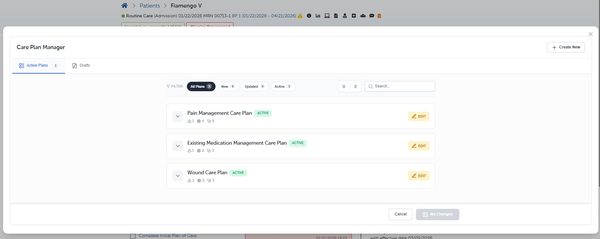 All the patient's care plans can be viewed from the Patient Dashboard > Quick View Care Plan Manager