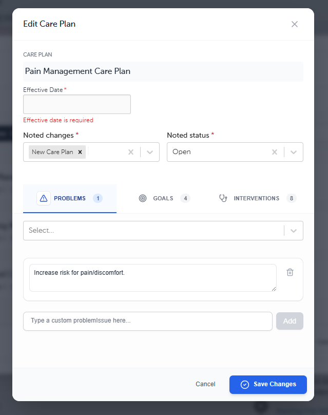 - Click on the orange icon and you will see the existing Care Plans. Click Add care plan or Edit an existing Care plan.