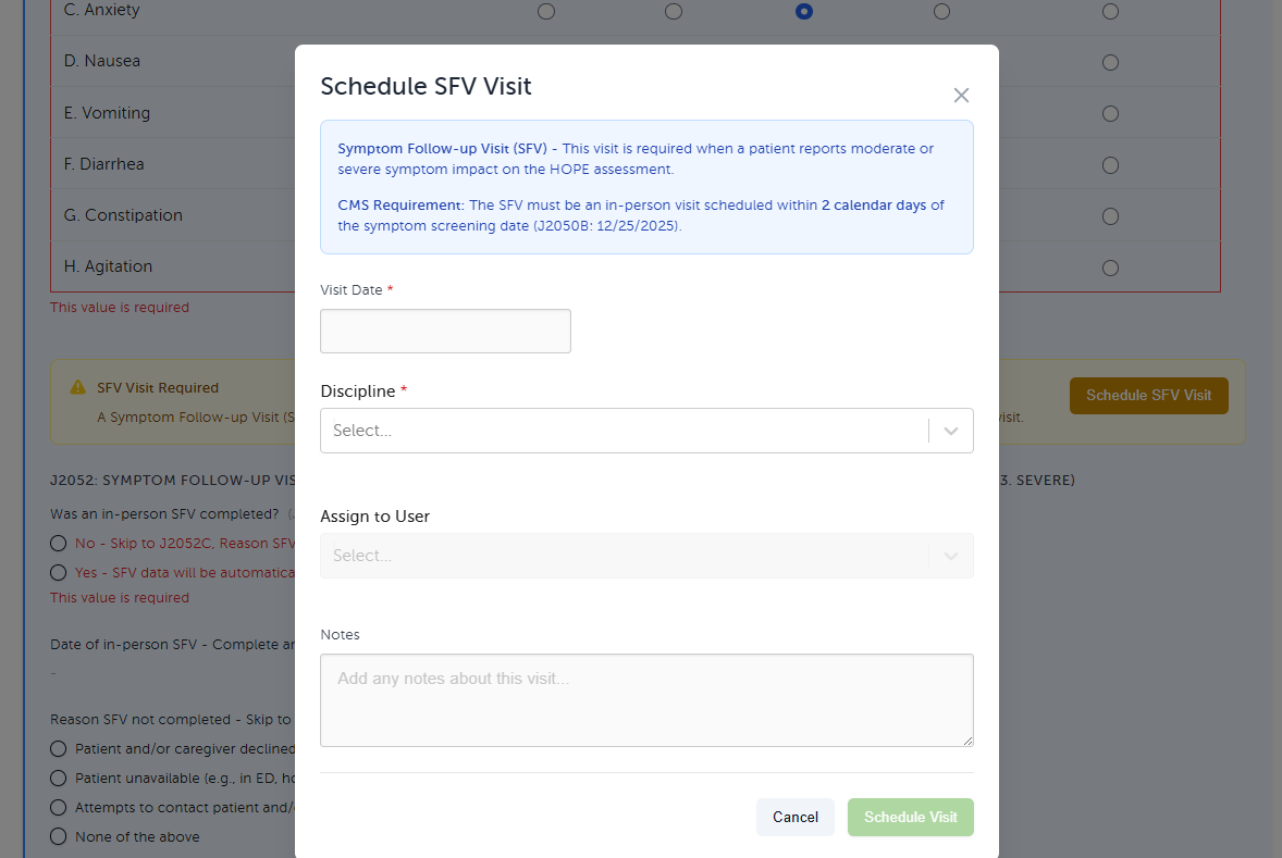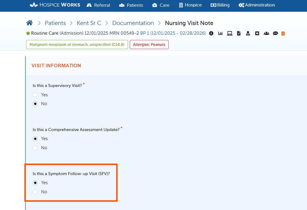 When an SFV is required, HospiceWorks will prompt the SFV visit automatically.
