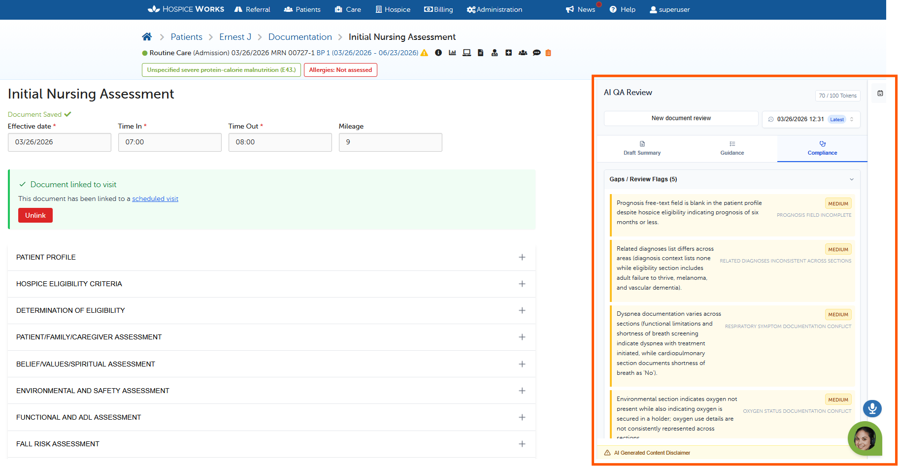 Flag Gaps: Identifies inconsistencies (e.g., if a patient's prognosis is 6 months or less, but the documented symptoms don't fully support that prognosis yet).